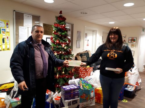 Terry Sweeney is seen here presenting the cheques on behalf of the company and its staff.